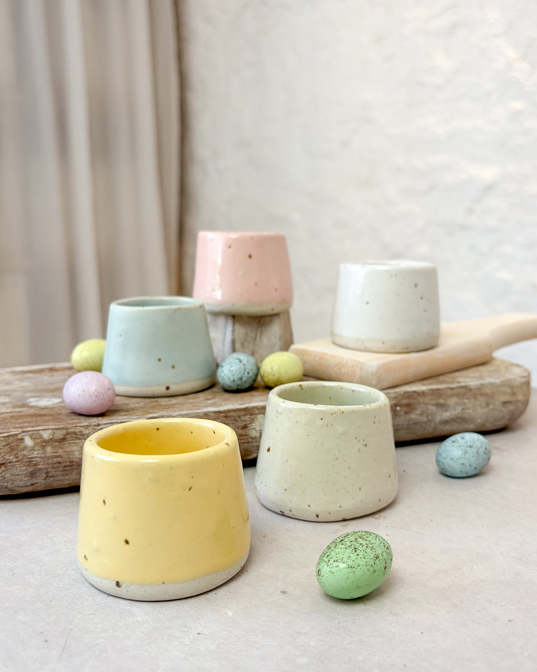 This is our signature range of plates, drinkware and bowls. Though they have the delicate appearance you’d expect of handmade pieces, they’re made from robust stoneware and are strong enough to be used every day, not just for special occasions. All of our tableware is dishwasher and oven safe.